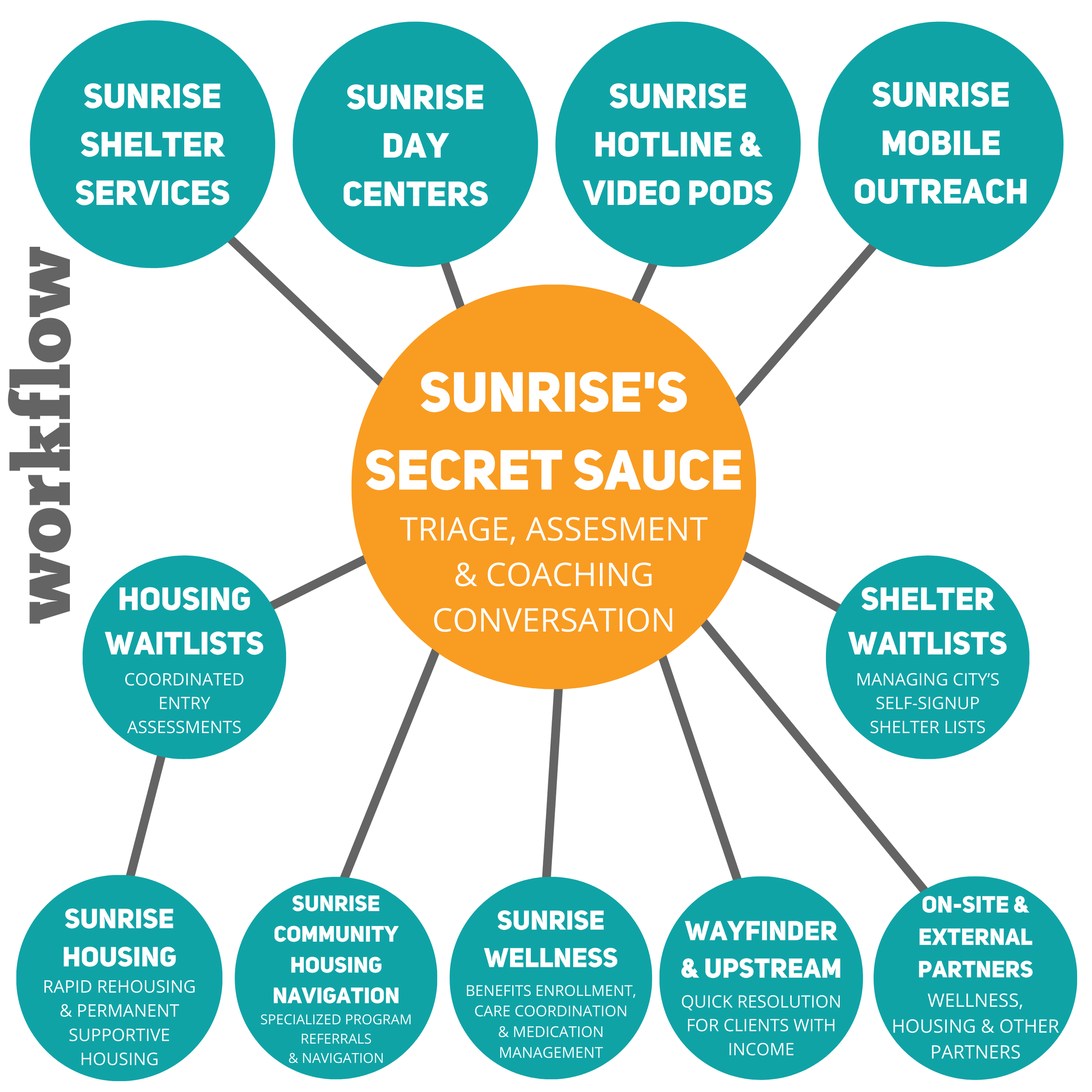 Sunrise's multi-access-point system allows clients to receive the same standard of care and referral options no matter where they enter our programs. Whether they're referred to Sunrise Housing, visit the Sunrise Hub, call the Sunrise Hotline, or encounter the Sunrise Mobile outreach team, clients will receive the same level of care and support. While other groups may do outreach or serve food, Sunrise does it all with a holistic, all-inclusive approach that allows us to prepare and successfully place clients into housing opportunities in our community. This approach creates our community-wide safety net to ensure clients don't fall through the cracks.